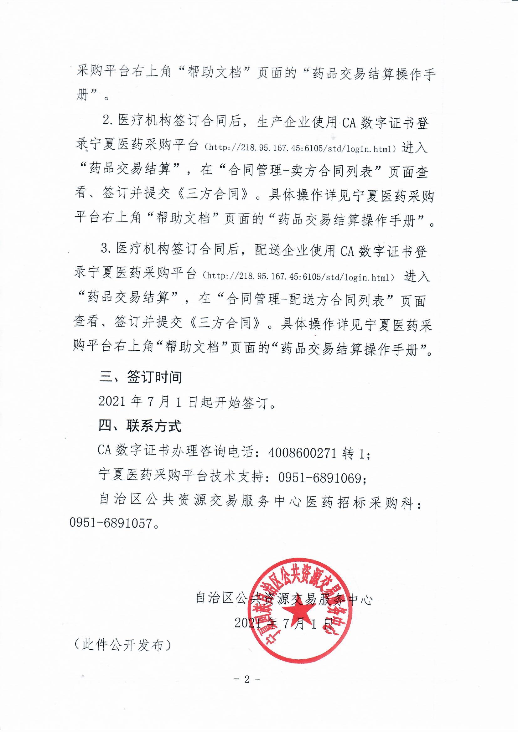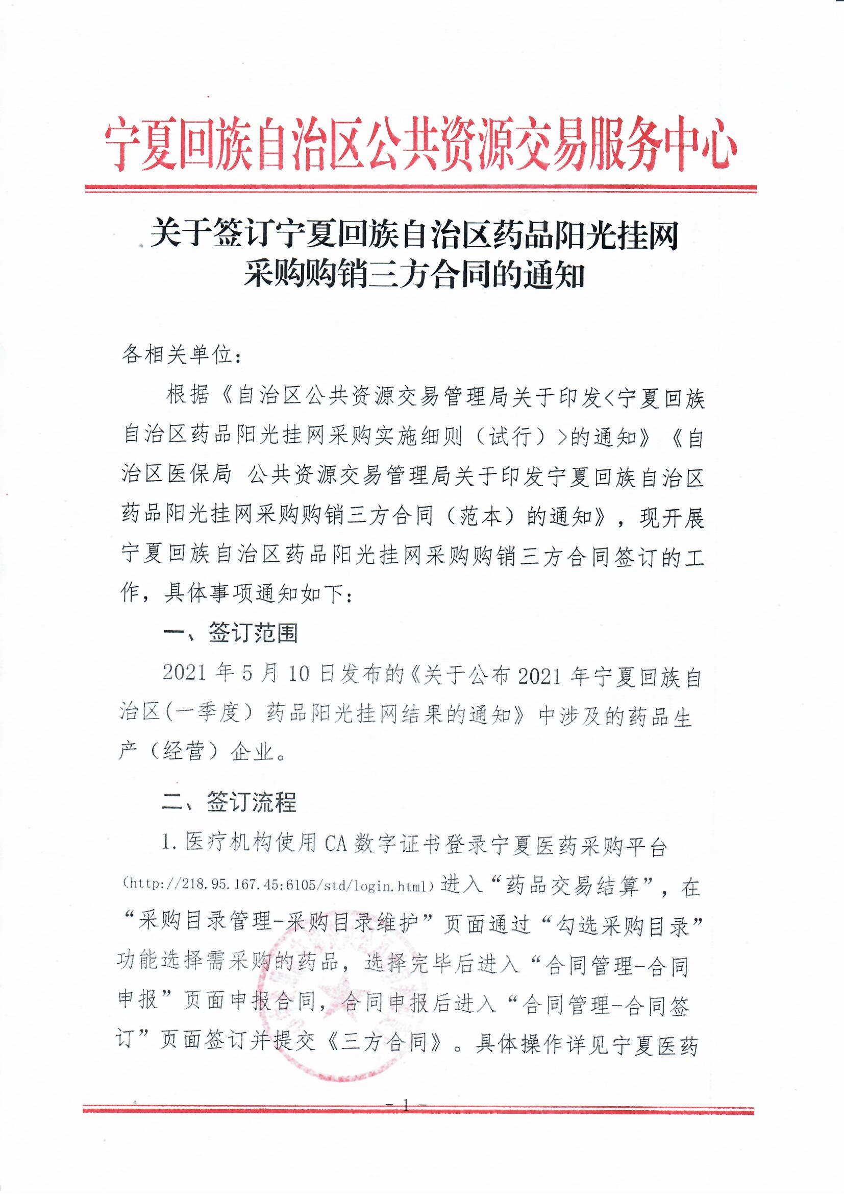 【宁夏】2021年宁夏自治区关于签订宁夏回族自治区药品阳光挂网采购购销三方合同的通知