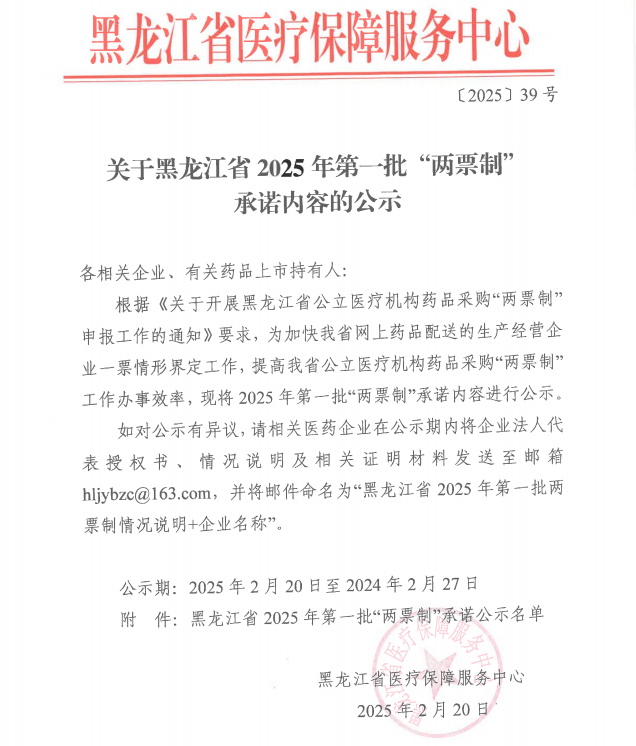【黑龙江】关于黑龙江省2025年第一批“两票制”承诺内容的公示