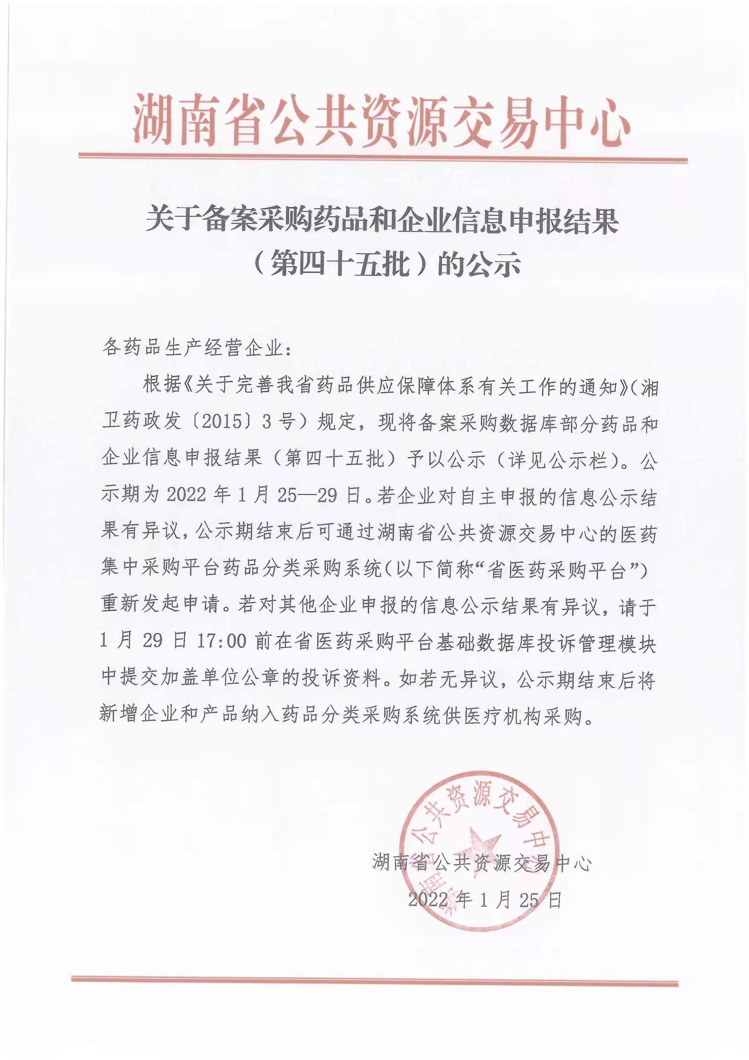 【湖南】湖南省关于备案采购药品和企业信息申报结果(第四十五批)的公示