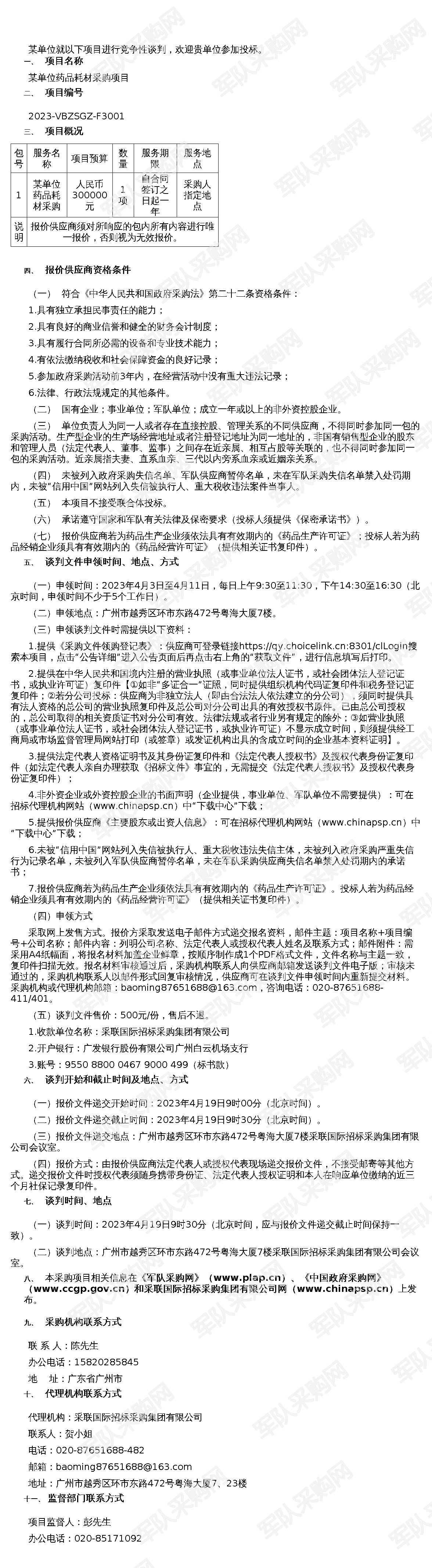 【军队采购】军队采购网某单位药品耗材采购项目谈判公告(2023-VBZSGZ-F3001)