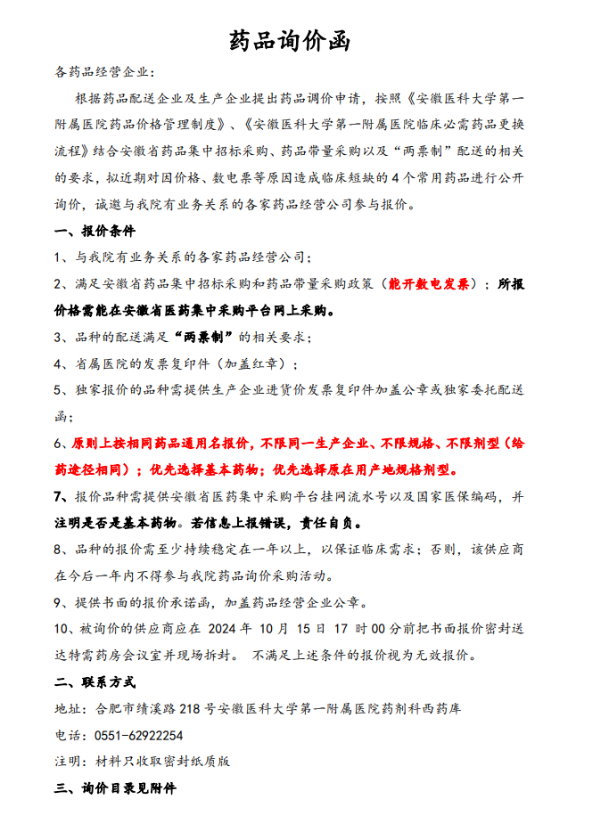 【安徽医科大学第一附属医院】安徽医科大学第一附属医院药品询价函(2024年第九次)