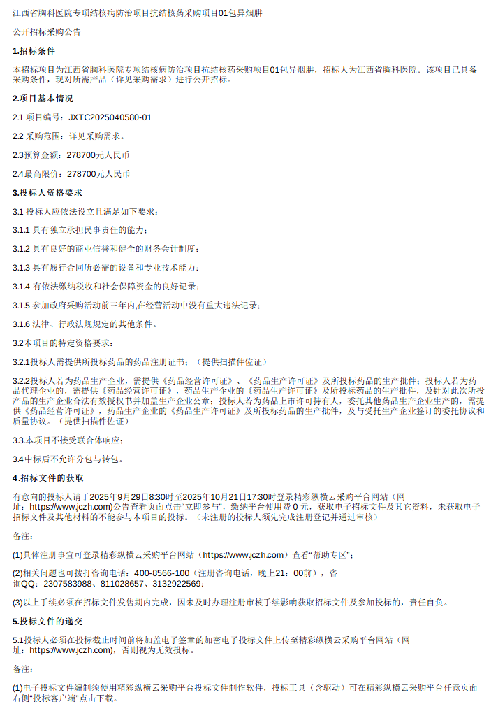 【江西省胸科医院】江西省胸科医院专项结核病防治项目抗结核药采购项目01包异烟肼公开招标采购公告
