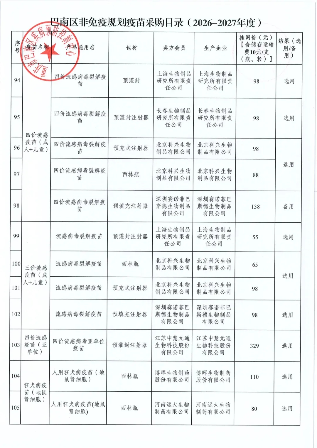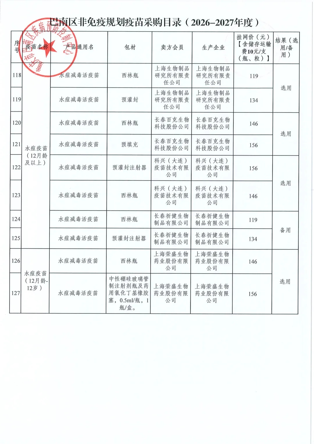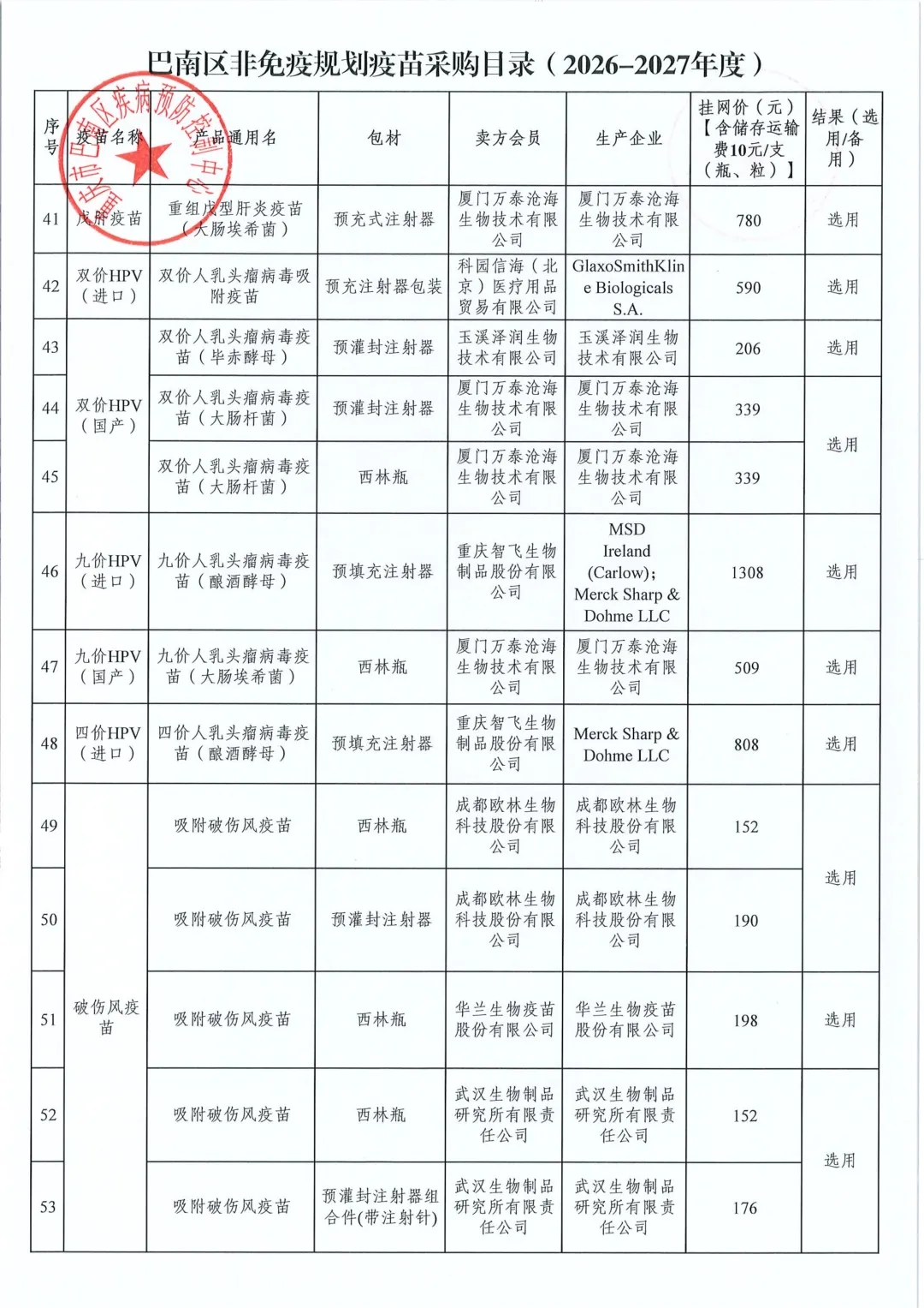 【重庆】关于巴南区2026-2027年度非免疫规划疫苗遴选结果的公示