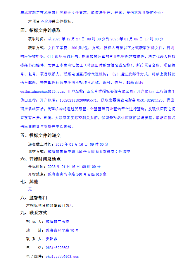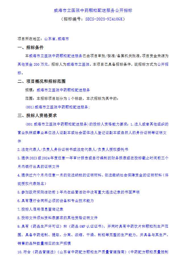 【威海市立医院】山东省威海市立医院中药颗粒配送服务公开招标