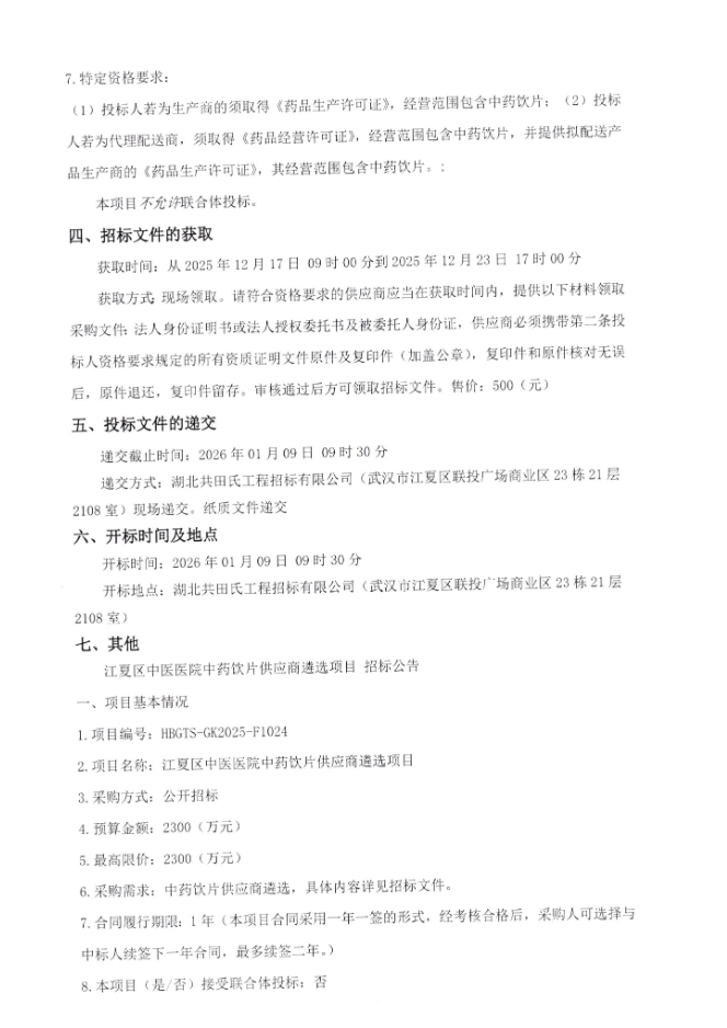 【武汉市江夏区中医医院】湖北省武汉市江夏区中医医院中药饮片供应商遴选项目招标公告