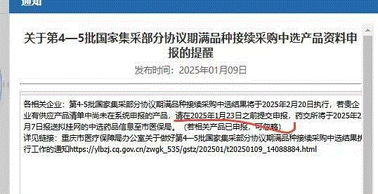各相关企业:第4-5批国家集采部分协议期满品种接续采购中选结果将于2025年2月20日执行,若贵企业有供应产品清单中尚未在系统申报的产品,请在2025年1月23日之前提交申报,药交所将于2025年2月7日报送拟挂网的中选药品信息至市医保局。(若相关产品已申报,可忽略)