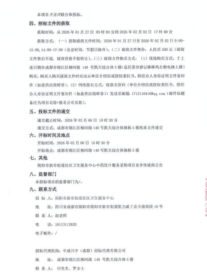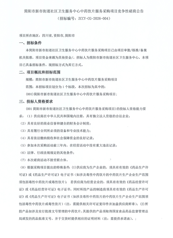 【成都市简阳市新市街道社区卫生服务中心】四川省简阳市新市街道社区卫生服务中心中药饮片服务采购项目竞争性磋商公告