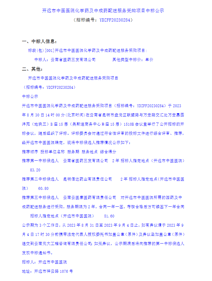 【红河哈尼族彝族自治州开远市中医医院】云南省红河哈尼族彝族自治州开远市中医医院化学药及中成药配送服务采购项目中标公示