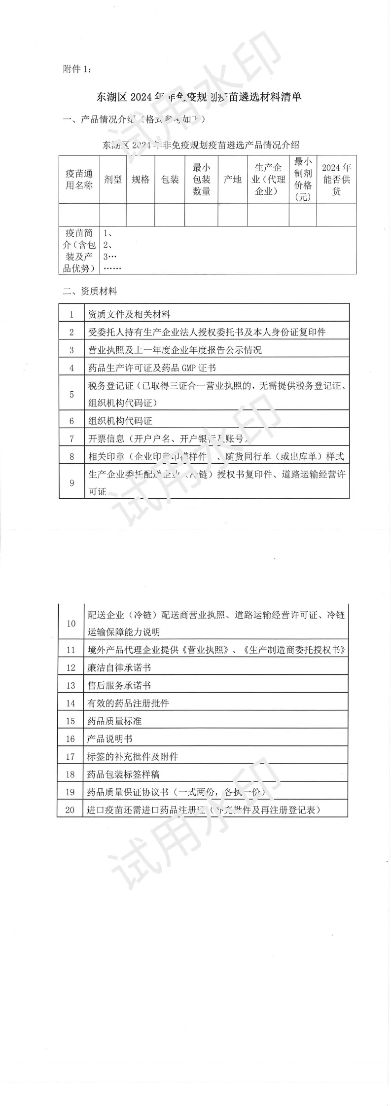 1、请符合条件有意愿参加遴选的生产企业(委托推广企业)于2024年7月18日前将遴选材料(材料清单见附件1)送至东湖区疾病预防控制中心免疫规划股,逾期将视作放弃不予受理。