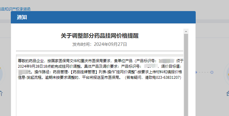 尊敬的药品企业,按国家医保局文件和重庆市医保局要求,贵单位产品(产品标识号: 须于2024年9月28日18点前完成挂网价调整。具体产品及调价要求:产品标识号: ,调价目标值: 。操作路径:药品管理-【药品挂牌管理】列表-操作“挂网价调整”-按要求上传材料和填报价格信息-发起流程。逾期未按要求调整的,平台将报送至市医保局。(若有疑问,请致电023-63831207)