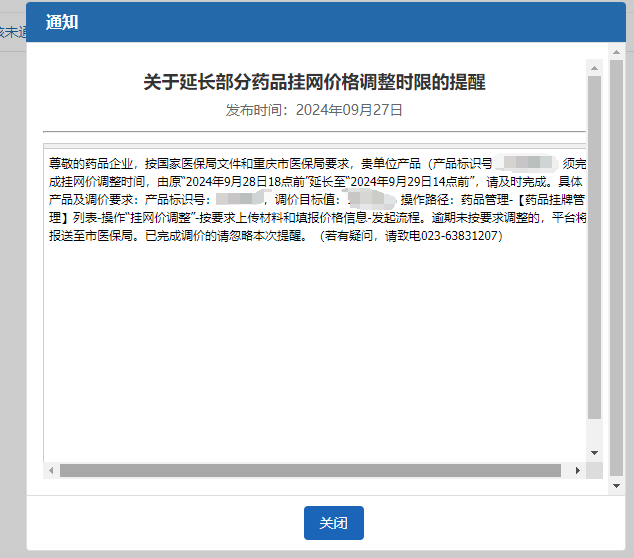 尊敬的药品企业,按国家医保局文件和重庆市医保局要求,贵单位产品(产品标识号: 须完成挂网价调整时间,由原“2024年9月28日18点前“延长至“2024年9月29日14点前",请及时完成。具体产品及调价要求:产品标识号: ,调价目标值: ,操作路径:药品管理-【药品挂牌管理】列表-操作"挂网价调整”-按要求上传材料和埴报价格信息-发起流程。逾期未按要求调整的,平台将报送至市医保局。已完成调价的请忽略本次提醒。(若有疑问,请致电023-63831207)