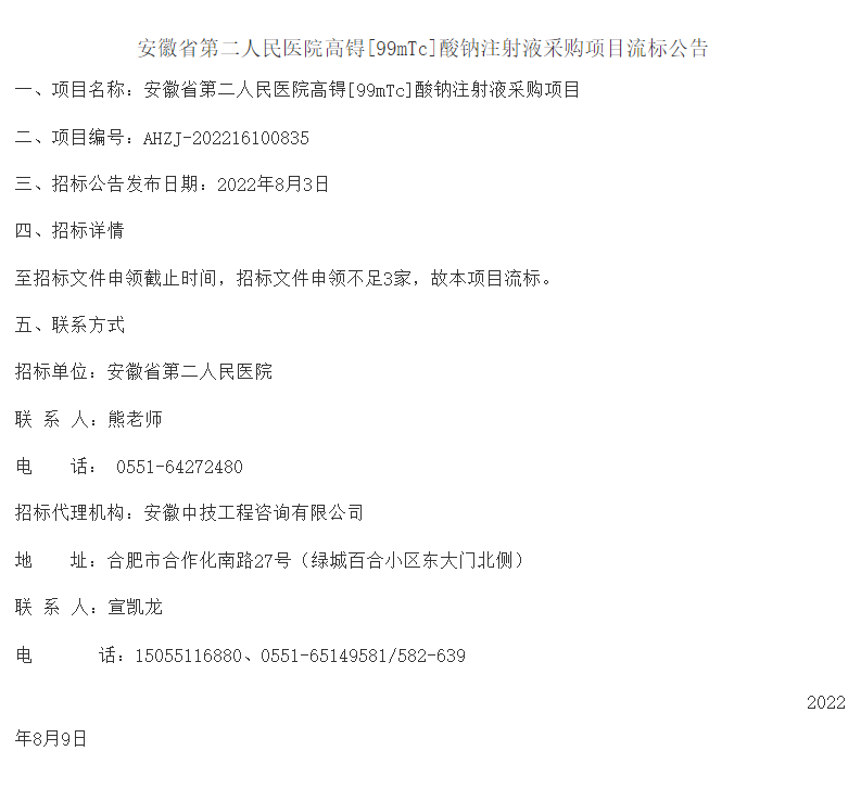 【安徽省第二人民医院】安徽省第二人民医院高锝〔99mTc〕酸钠注射液采购项目流标公告