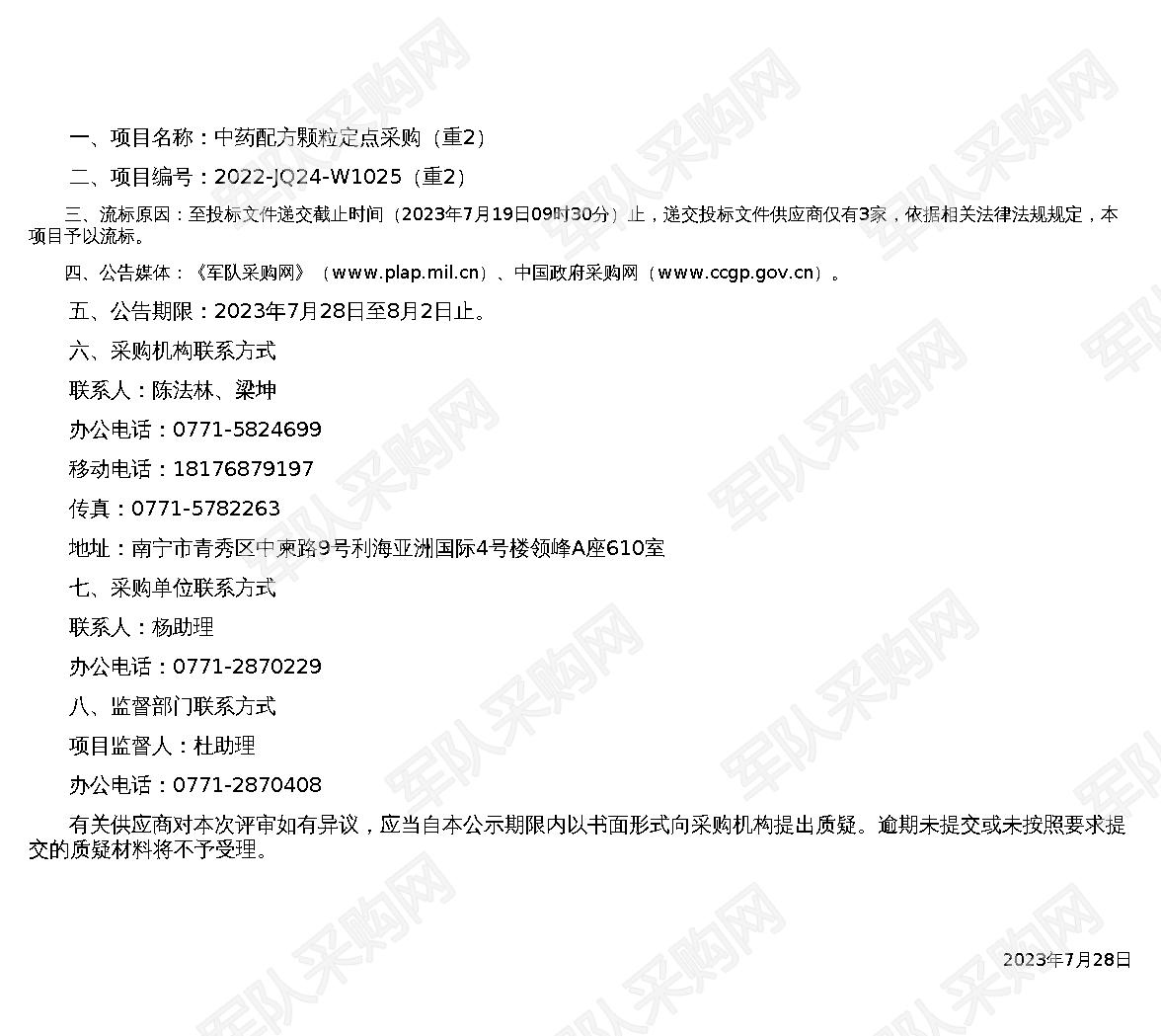 【南宁市某医院】军队采购网南宁市某医院中药配方颗粒定点采购(重2)流标公告(2022-JQ24-W1025(重2))