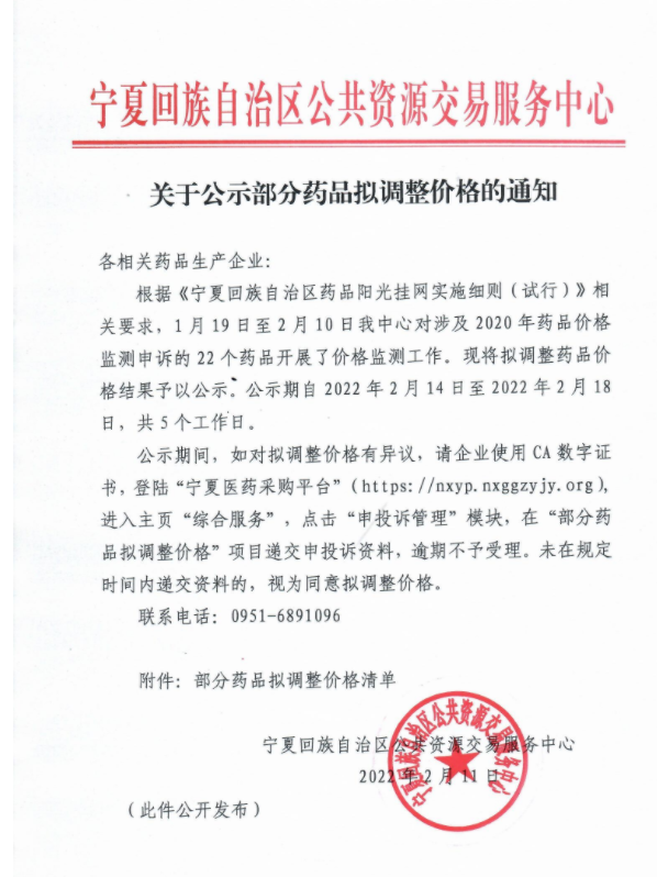 【宁夏】宁夏回族自治区关于公示部分药品拟调整价格的通知(20220211)