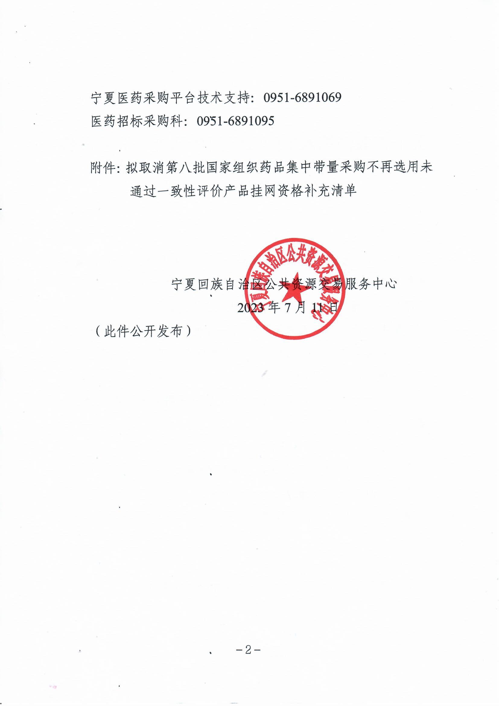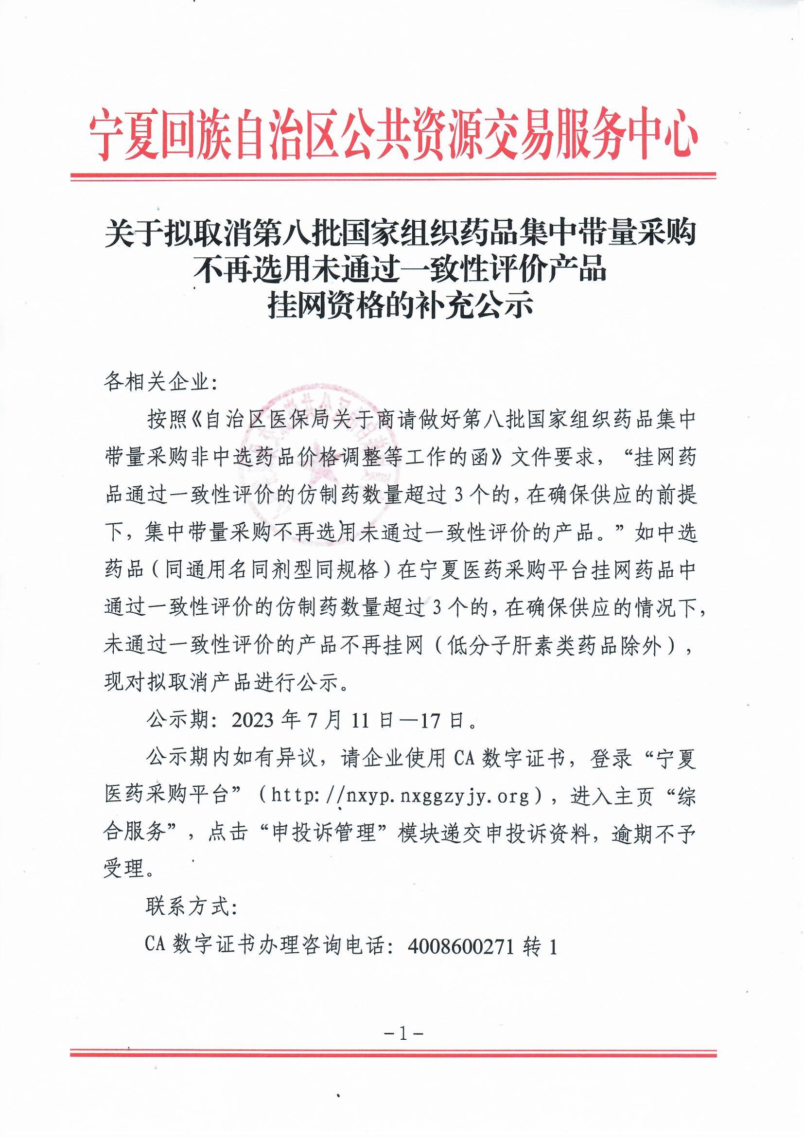 按照《自治区医保局关于商请做好第八批国家组织药品集中带量采购非中选药品价格调整等工作的函》文件要求, "挂网药品通过一致性评价的仿制药数量超过3个的,在确保供应的前提下,集中带量采购不再选用未通过一致性评价的产品。”如中选药品(同通用名同剂型同规格)在宁夏医药采购平台挂网药品中通过一致性评价的仿制药数量超过3个的,在确保供应的情况下,未通过一致性评价的产品不再挂网(低分子肝素类药品除外),现对拟取消产品进行公示。