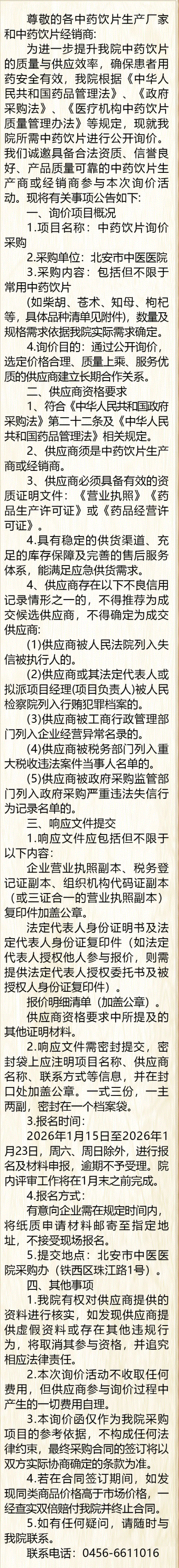 【黑河市北安市中医医院】黑龙江省北安市中医医院2026年中药饮片采购项目询价公告