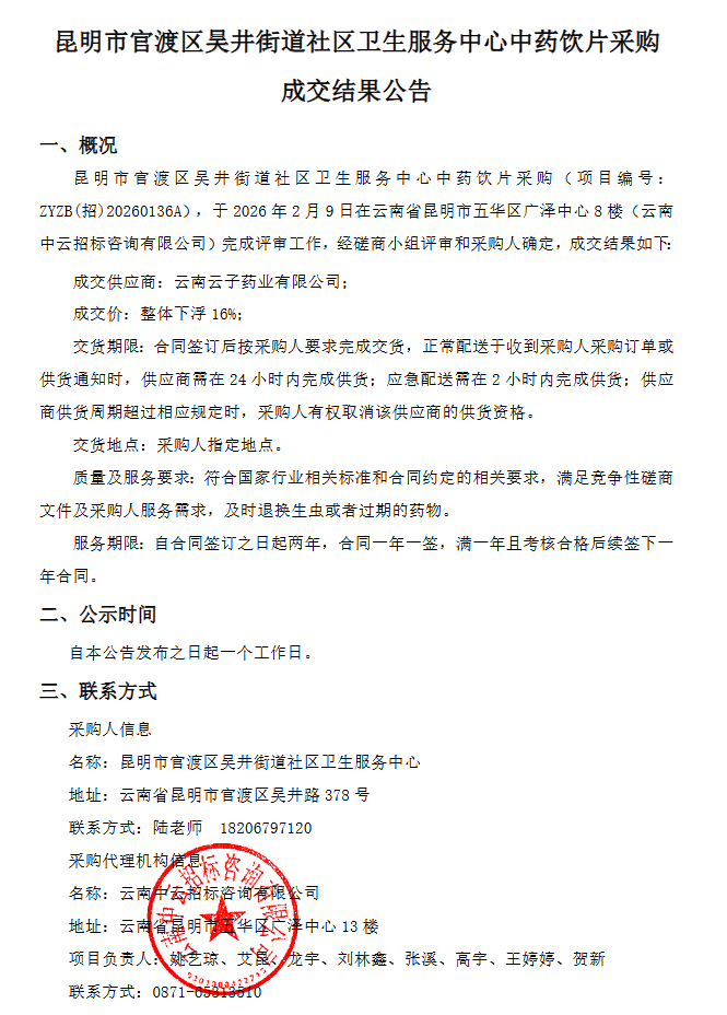 【昆明市盘龙区鼓楼街道社区卫生服务中心】云南省昆明市盘龙区鼓楼街道社区卫生服务中心中药饮片采购成交结果公告