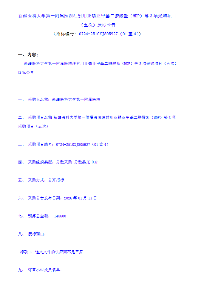 【新疆医科大学第一附属医院】新疆医科大学第一附属医院注射用亚锡亚甲基二膦酸盐(MDP)等3项采购项目(五次)废标公告