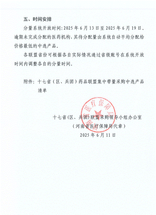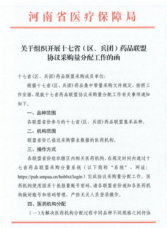 【河南】关于开展十七省药品联盟协议采购量分配工作的函