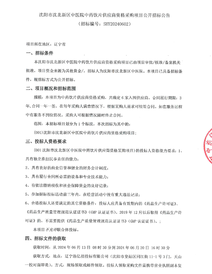 【沈阳市沈北新区中医院】辽宁省沈阳市沈北新区中医院中药饮片供应商资格采购项目公开招标公告