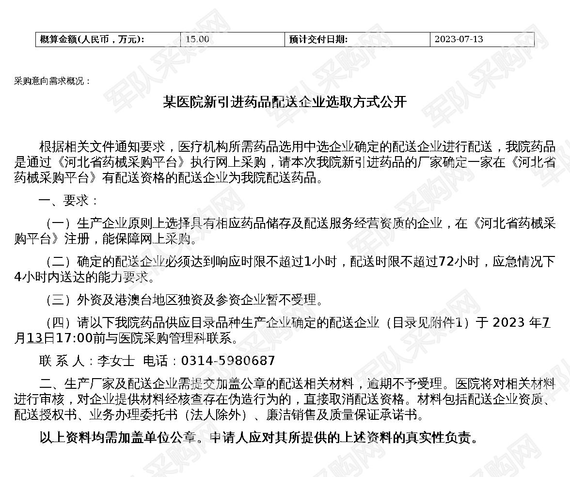 【军队采购】军队采购网某医院新引进药品配送企业选取方式公开(20230703)