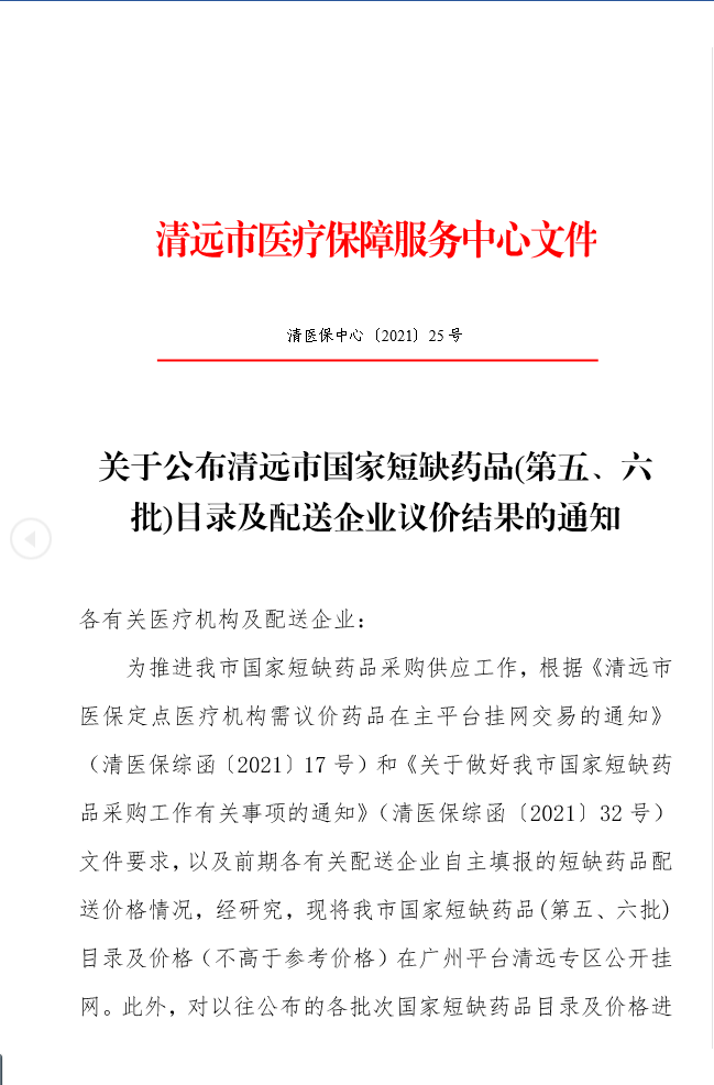 【清远】广东省关于公布清远市国家短缺药品(第五、六批)目录及配送企业议价结果的通知