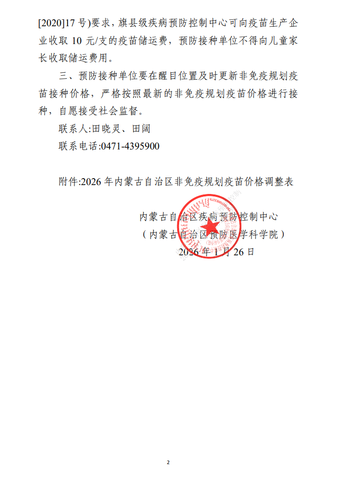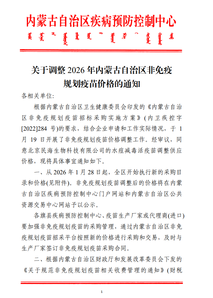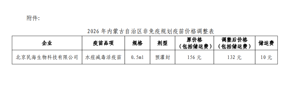 【内蒙】关于调整2026年内蒙古自治区非免疫规划疫苗价格的通知