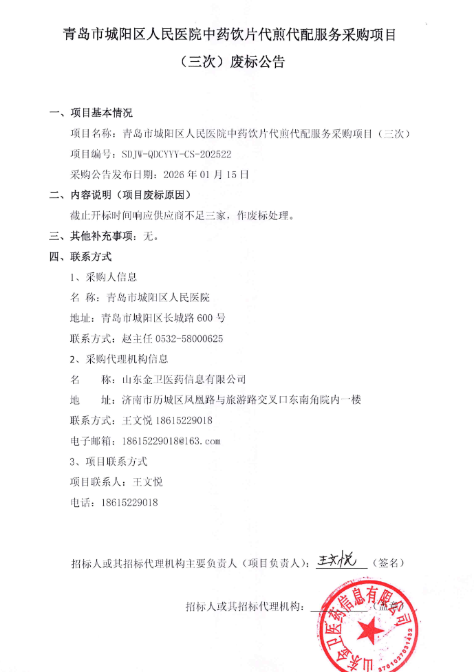 【青岛市城阳区人民医院】山东省青岛市城阳区人民医院中药饮片代煎代配服务采购项目(三次)废标公告
