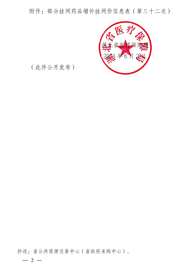 【鄂州】鄂医保函【2024】80号省医疗保障局关于部分挂网药品增补挂网价(第三十二次)的通知