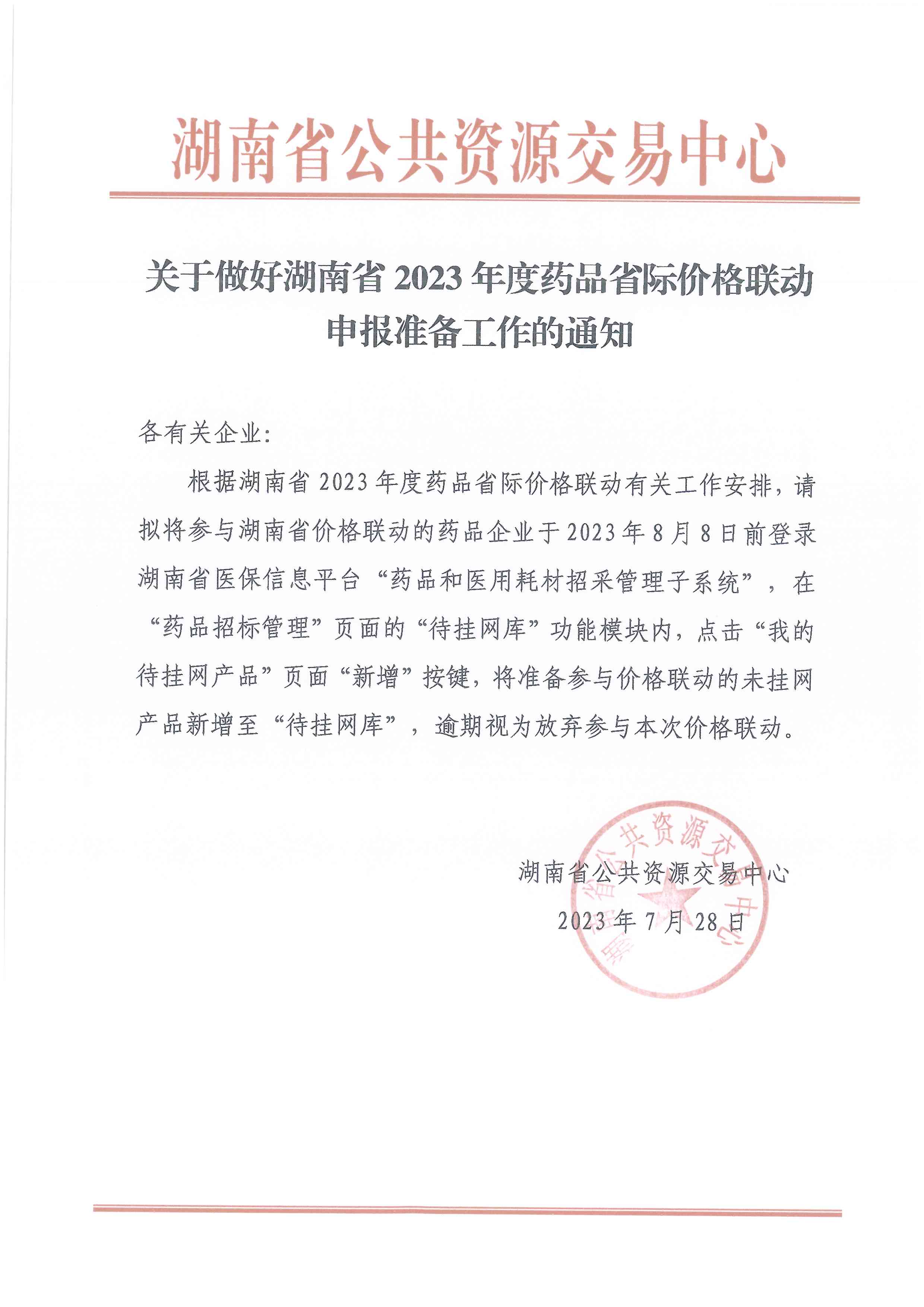 【湖南】关于做好湖南省2023年度药品省际价格联动申报准备工作的通知
