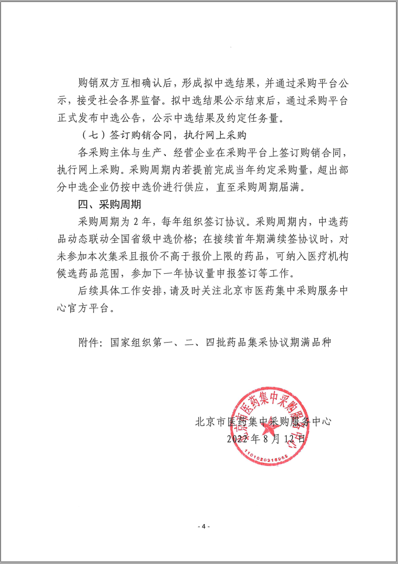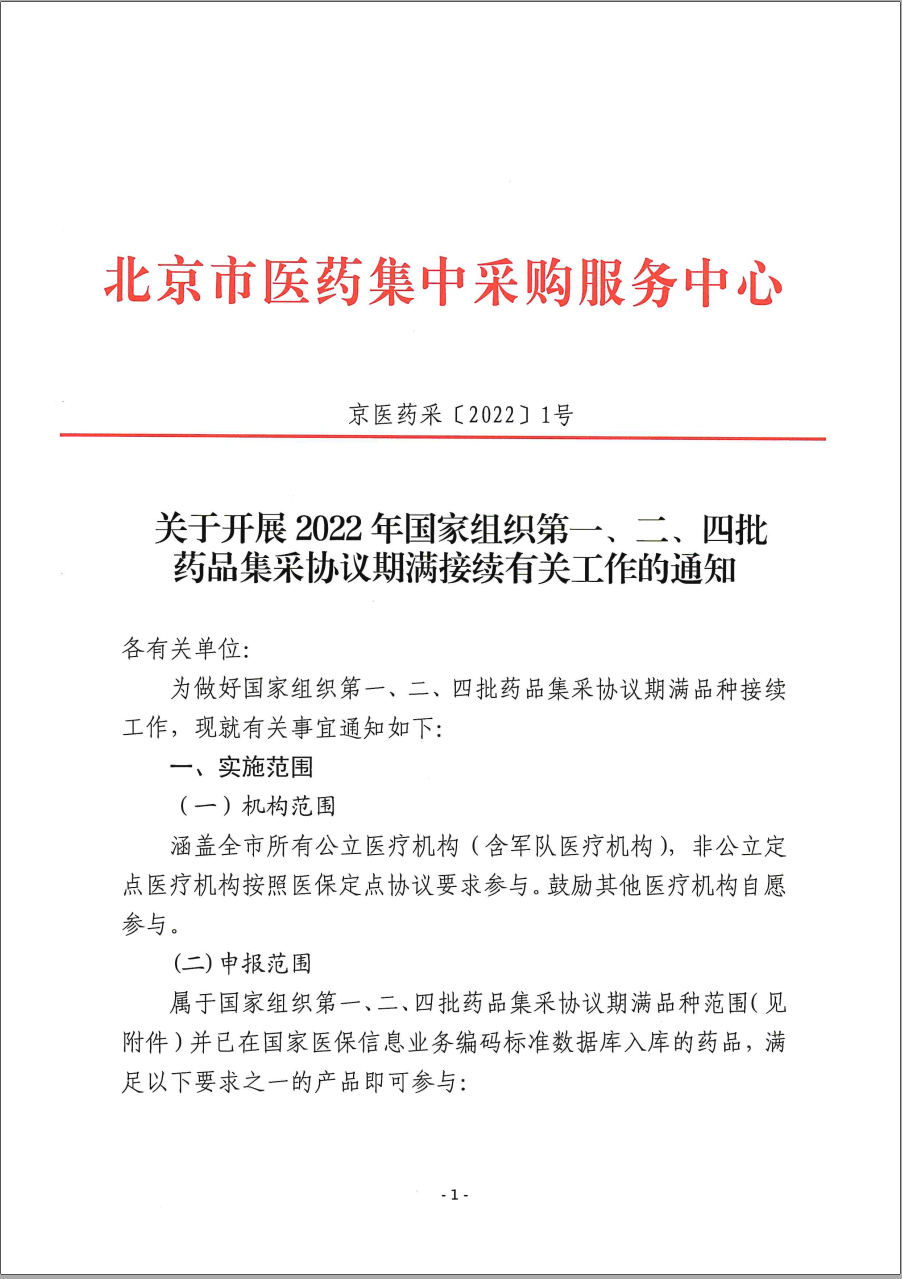 【北京】关于开展2022年国家组织第一、二、四批药品集采协议期满接续有关工作的通知