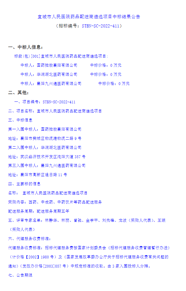 【湖北省襄阳市宜城市人民医院】药品配送商遴选项目中标结果公告