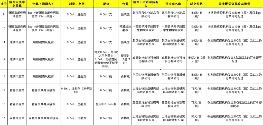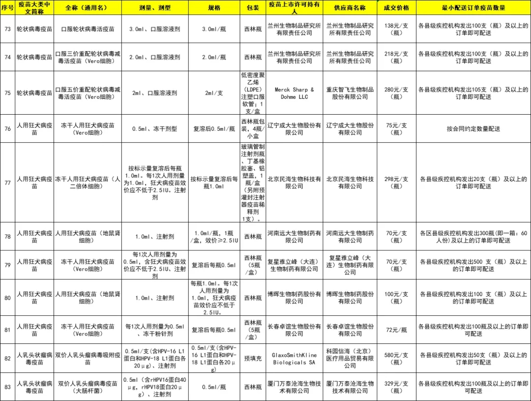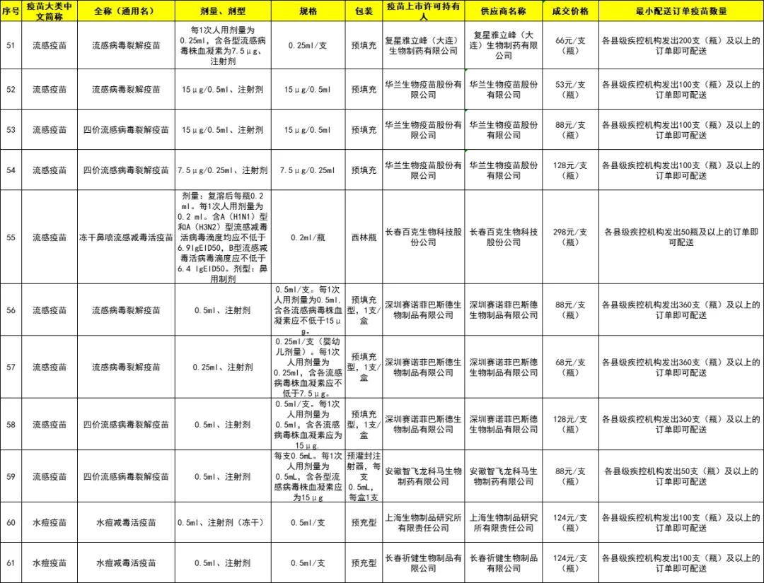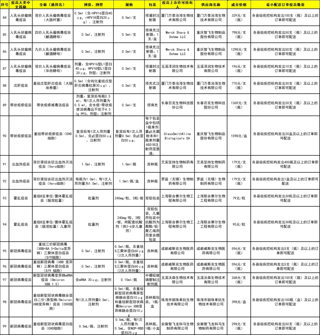 城厢区2024年非免疫规划疫苗成交品种遴选结果目录