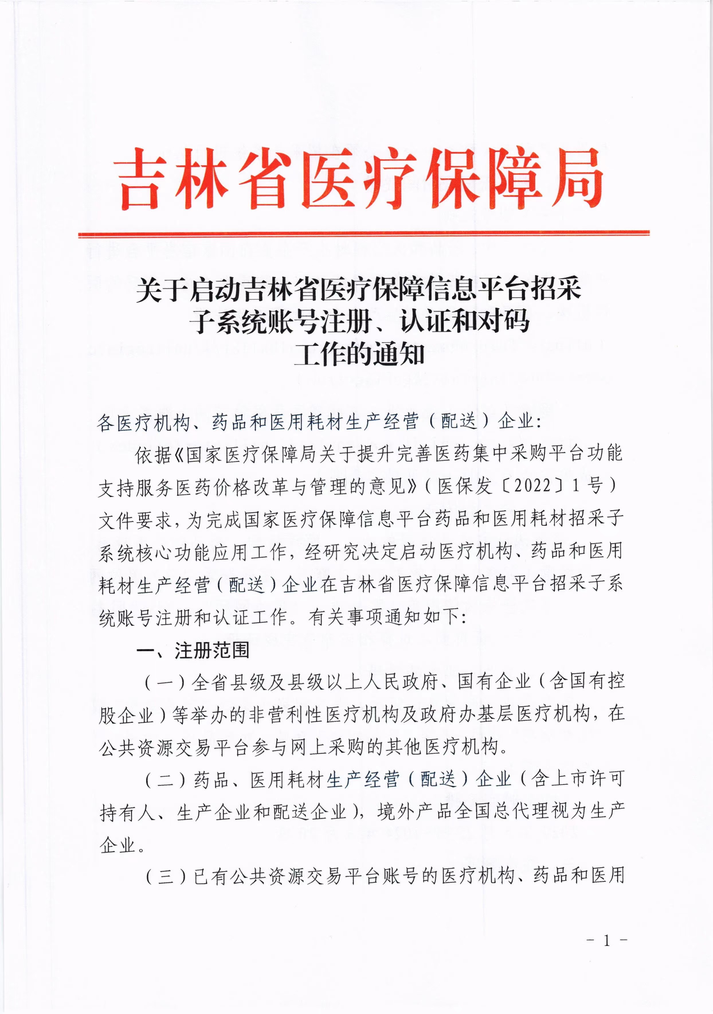 依据《国家医疗保障局关于提升完善医药集中采购平台功能支持服务医药价格改革与管理的意见》(医保发〔2022〕1号)文件要求,为完成国家医疗保障信息平台药品和医用耗材招采子系统核心功能应用工作,经研究决定启动医疗机构、药品和医用耗材生产经营(配送)企业在吉林省医疗保障信息平台招采子系统账号注册和认证工作。有关事项通知如下:
