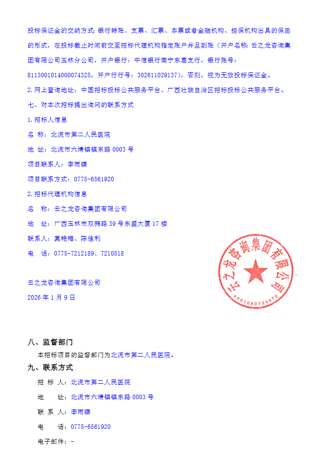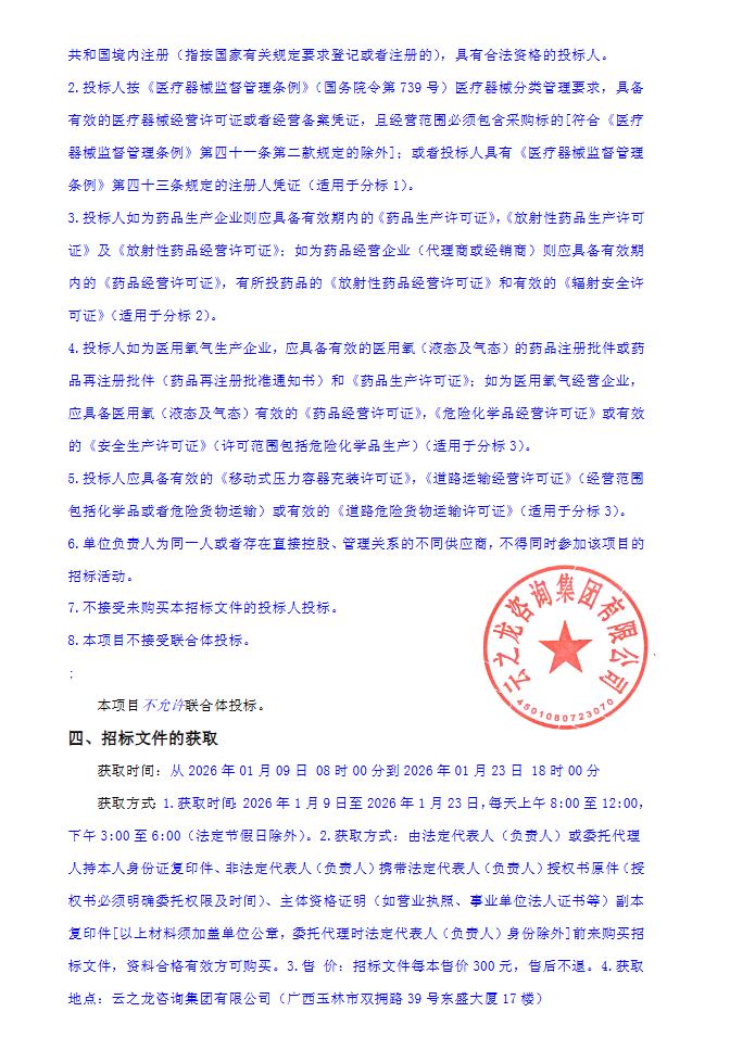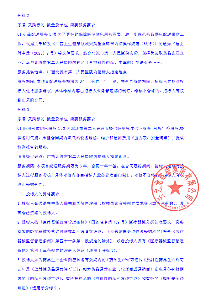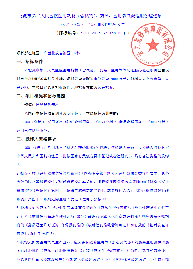 【北流市第二人民医院】广西壮族自治区北流市第二人民医院医用耗材(含试剂)、药品、医用氧气配送服务遴选项目YZLYL2025-G3-158-BLQT招标公告