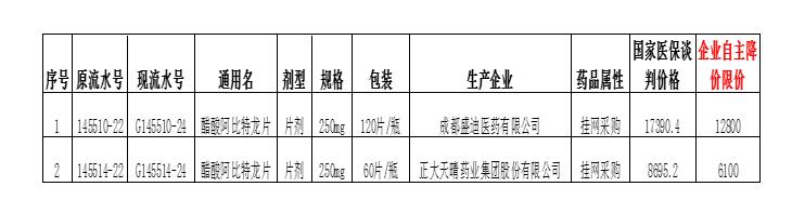 依据《人力资源社会保障部关于将36种药品纳入国家基本医疗保险、工伤保险和生育保险药品目录乙类范围的通知》(人社部发〔2017〕54号),现将成都盛迪医药有限公司和正大天晴药业集团股份有限公司“醋酸阿比特龙片 ”统一调整为“国家医保谈判药品”,并根据企业自主申请下调相关药品的“企业自主降价限价”(详见下表),请各医疗机构及时下调价格。