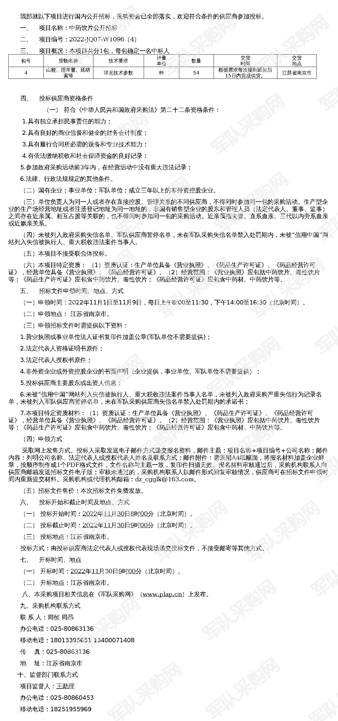 【军队采购网】中药饮片公开招标(2022-JQ07-W1096(4))