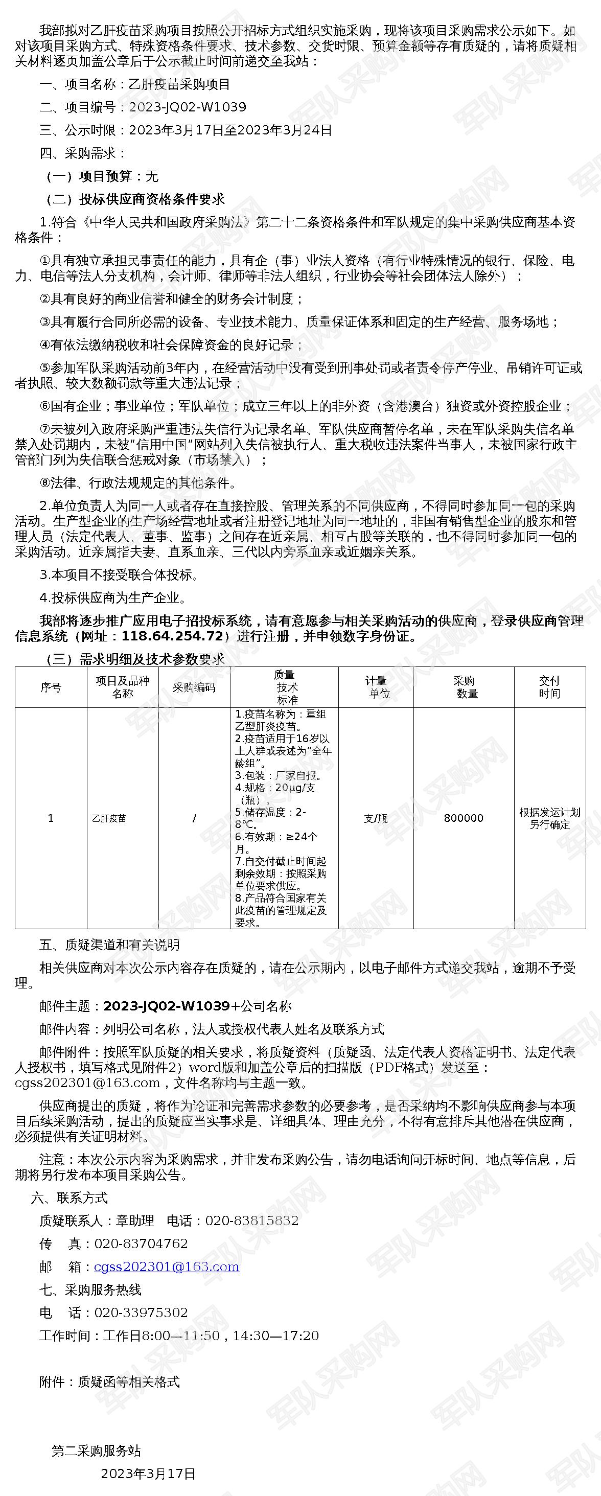 【军队采购】军队采购网乙肝疫苗采购项目需求公示(2023-JQ02-W1039)