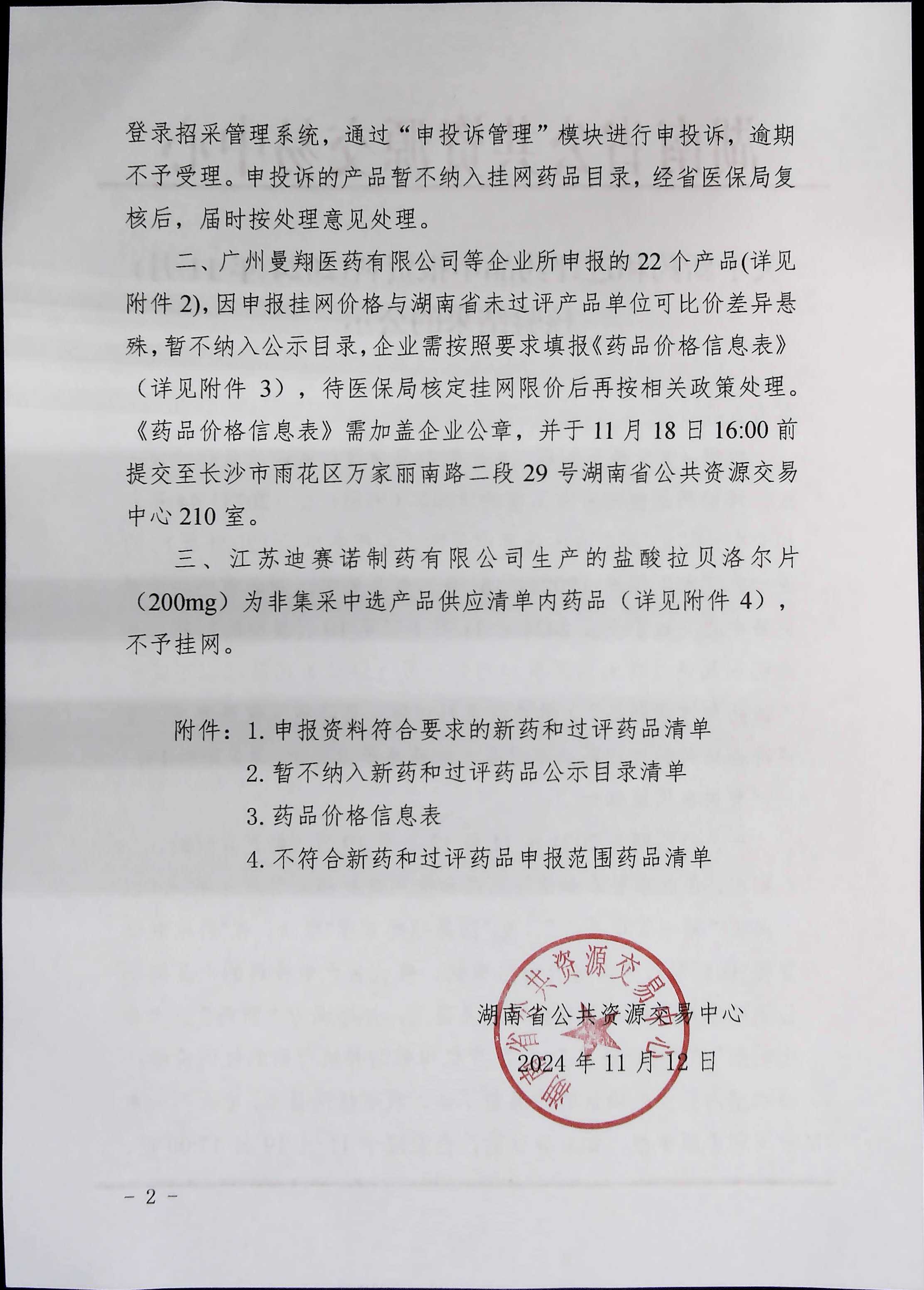 根据《关于规范新药、参比制剂及通过仿制药质量和疗效一致性评价药品挂网采购工作的通知》(湘医保函〔2023〕44号)和《关于印发<湖南省医药集中采购公共服务事项(2024版)>的通知》(湘医保发(2024)15号)有关要求,湖南省公共资源交易中心完成了企业2024年11月1日至10日提交的新药、参比制剂及通过仿制药质量和疗效一致性评价类药品(以下简称“新药和过评药品”)的申报资料核验,且经省医保局复核。现将符合新药和过评药品申报要求的药品予以公示(详见附件1),并就有关事项通知如下: