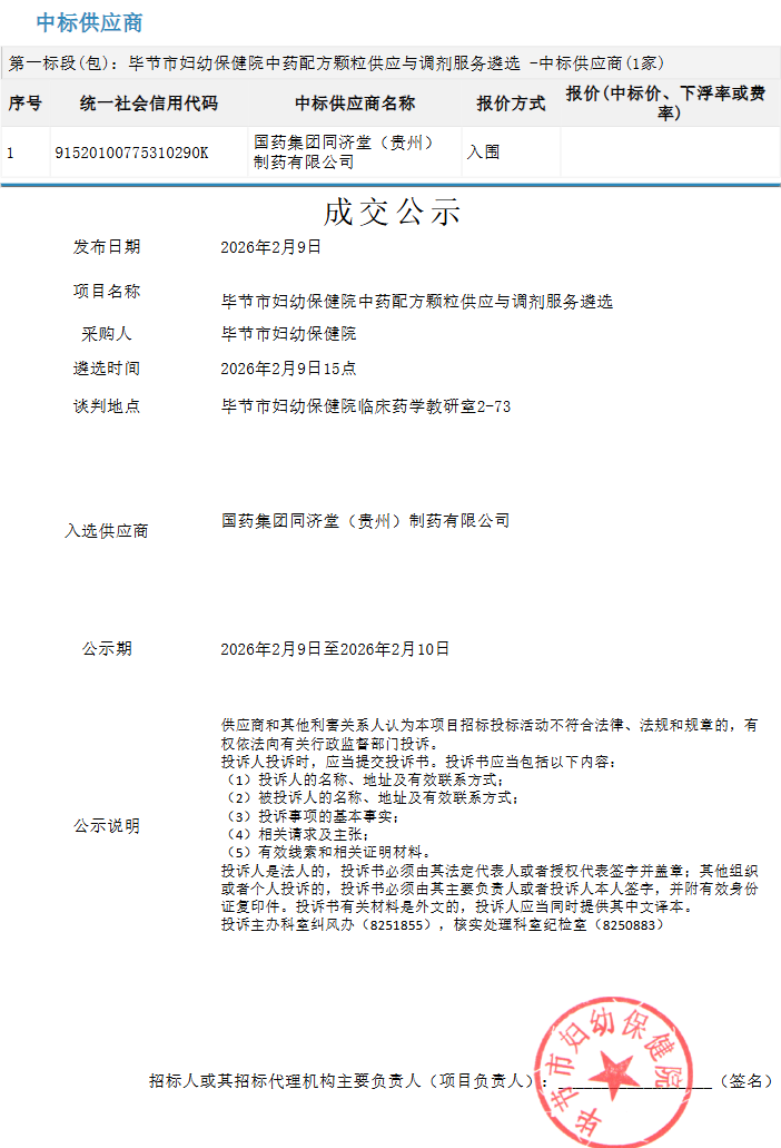 【毕节市妇幼保健院】贵州省毕节市妇幼保健院中药配方颗粒供应与调剂服务遴选结果公示