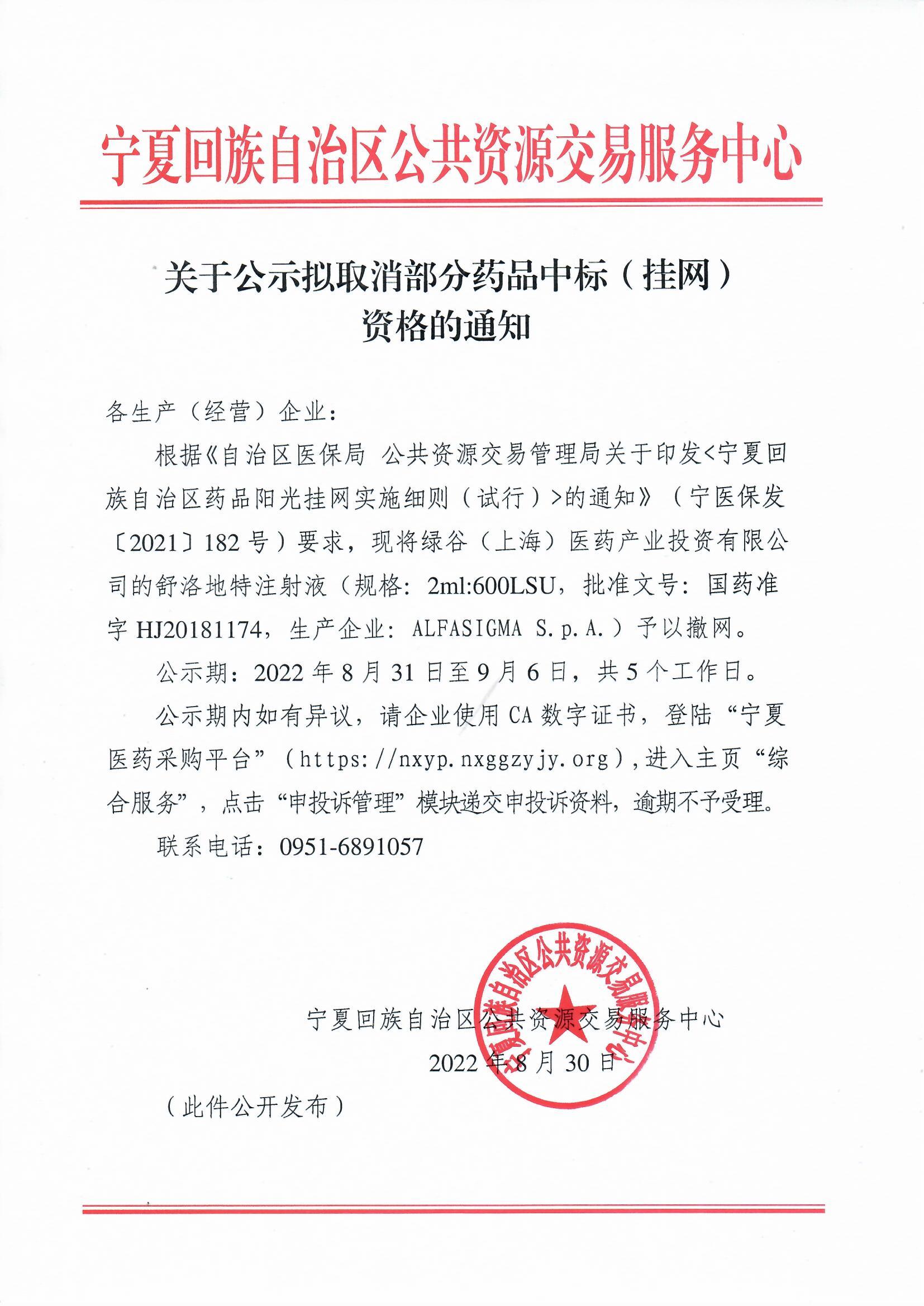 【宁夏】关于公示拟取消部分药品中标(挂网) 资格的通知