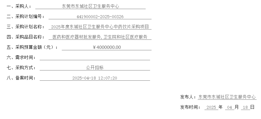 【东莞市东城社区卫生服务中心】广东省东莞市2025年度东城社区卫生服务中心中药饮片采购项目