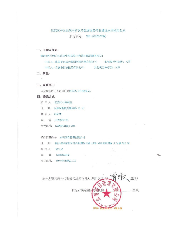 【安康市汉滨区中医医院】陕西省安康市汉滨区中医医院中药饮片配送服务项目遴选入围结果公示