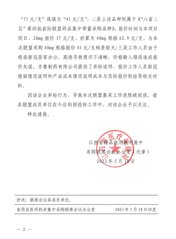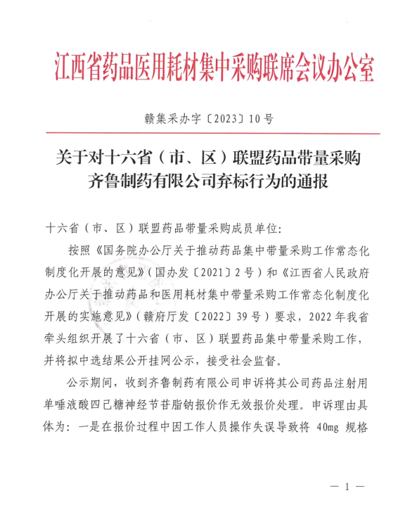公示期闹,收到齐鲁制药有限公司申诉将其公司药品注射用单唾液酸四已裙神经节苷脂钠报价作无效报价处理。冲诉理由具体为:一是在报价过程中因工作人具操作失误导致将40mg规格“74元/支”误填为“41元/支”;二是上述品种周质于《“八省二区”第四批省际联盟药品集中带量禾购品种》。报价时间与本项目同日,20mg招价37元/支,折算为40mg规格62.9元/支,与本次联置采购40mg规格报价41元/支相差较大;三是工作人员由于感染所冠居家办公,高烧导致意识不清晰,价格输入错误造成报价失误,齐鲁制药有限公司提供了弃标说明、报价工作人员新冠惑染情况说明和产品成本情况说明成本与实际报价倒挂等相关材料。