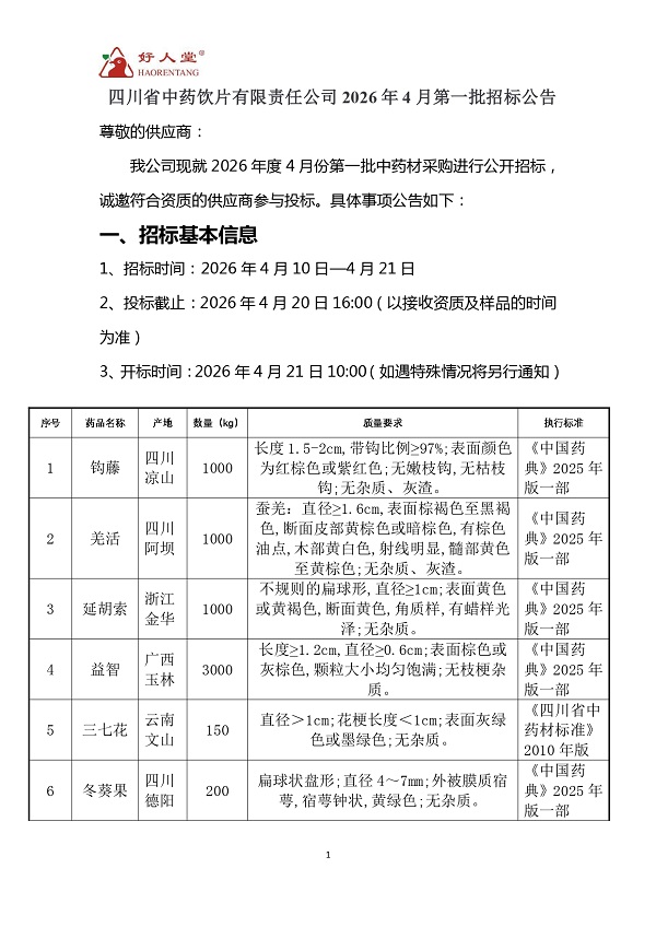 【四川省中药饮片有限责任公司】四川省中药饮片有限责任公司采购计划