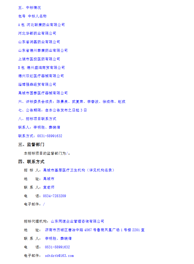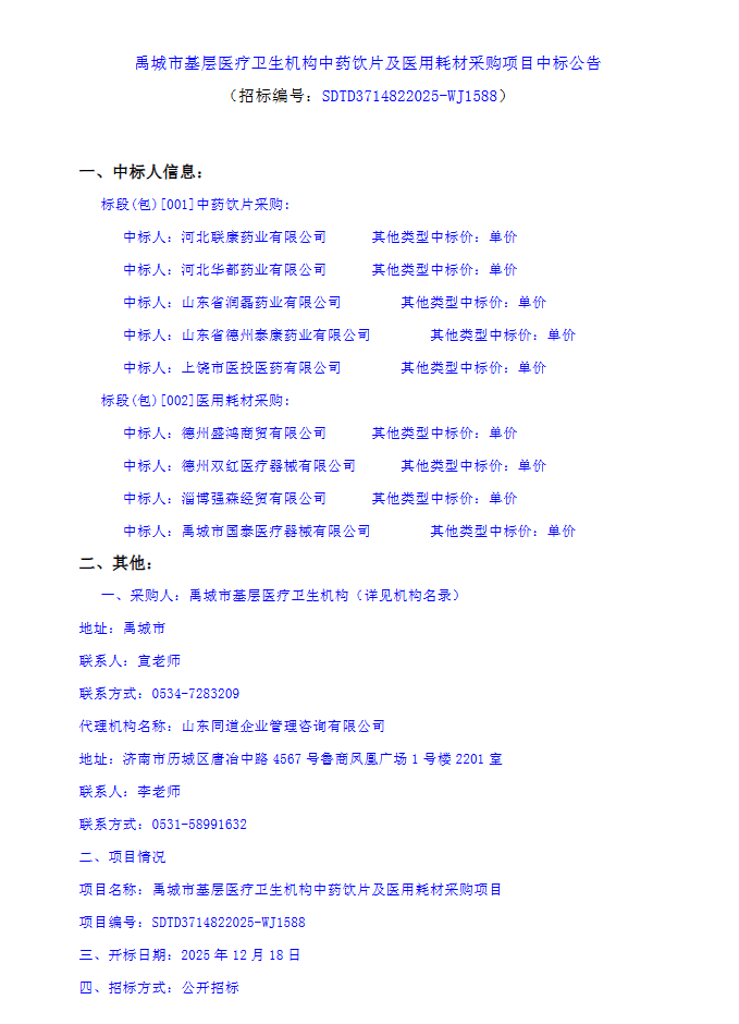 【德州市禹城市基层医疗卫生机构】山东省德州市禹城市基层医疗卫生机构中药饮片及医用耗材采购项目中标公告