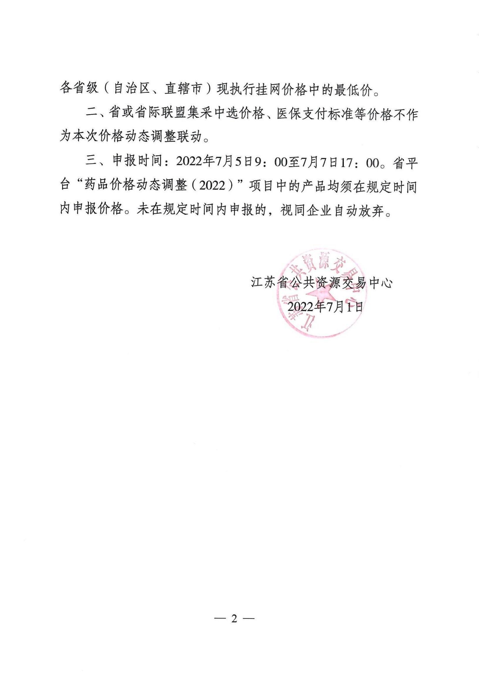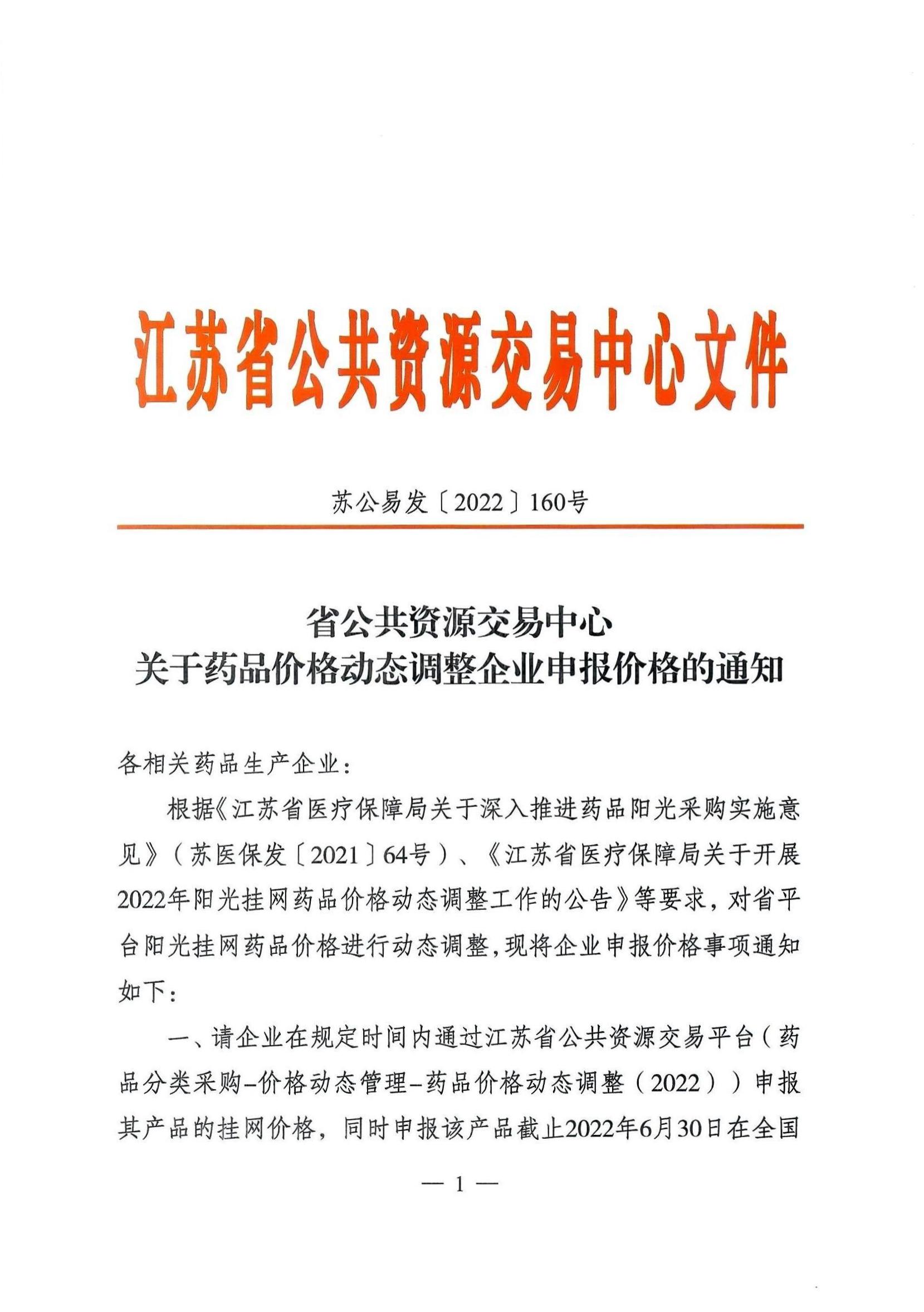 【江苏】省公共资源交易中心关于药品价格动态调整企业申报价格的通知
