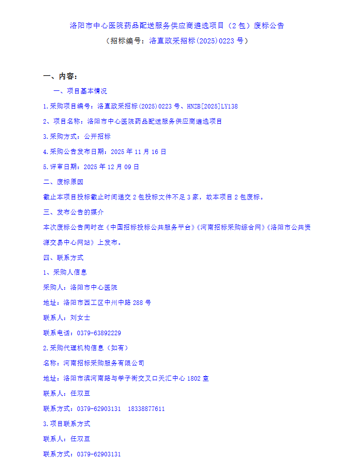 【洛阳市中心医院】河南省洛阳市中心医院药品配送服务供应商遴选项目(2包)废标公告