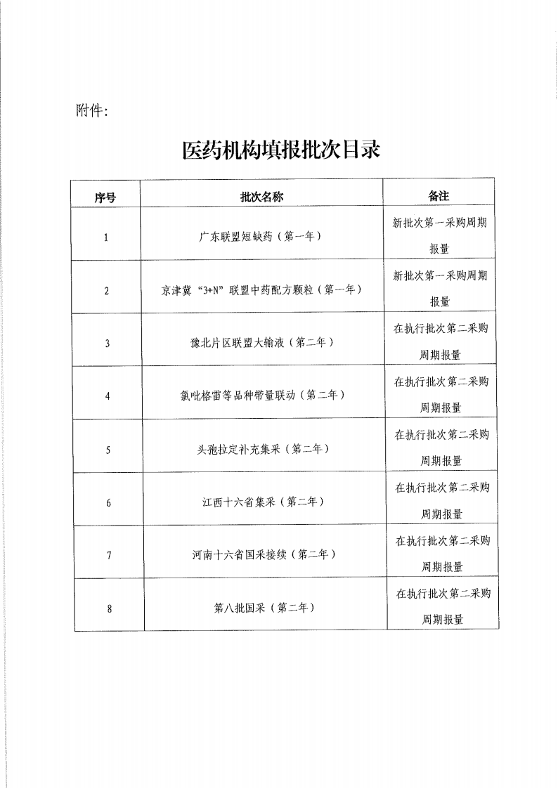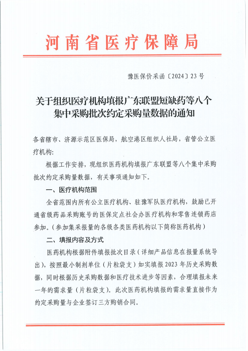 【河南】河南省关于组织医疗机构填报广东联盟短缺药等八个集中采购批次约定采购量数据的通知