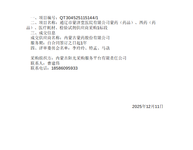 【通辽市蒙济堂医院有限公司】内蒙古自治区通辽市蒙济堂医院有限公司蒙药(药品)、西药(药品)、医疗耗材、检验试剂供应商采购结果公告1